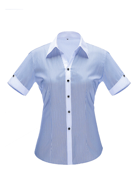 品名:女短袖v領(lǐng)襯衣;版型:修身版;貨號(hào):YWD3501 ;面料:Y3501;顏色:藍(lán)色細(xì)條紋 ;Fabric:C35/T65