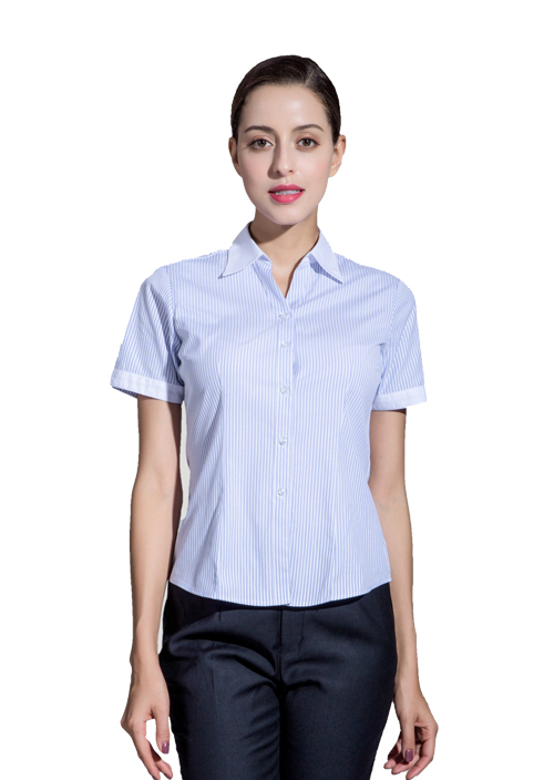 品名:女短袖V領襯衣;版型:修身版;貨號:TWD6001 ;面料:T6001;顏色:藍豎條紋白領白袖口 ;Fabric:C60/T40/80/2*45S