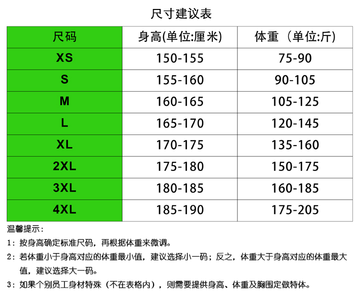 溫馨提示:請對照每個員工的身高和體重選擇尺碼,根據(jù)您訂購的產(chǎn)品,選擇相應(yīng)的尺碼圖表,先用身高畫出橫線,再用體重畫出豎線,交叉點所在色塊表示合適的尺碼(身高單位:cm,體重單位:kg)